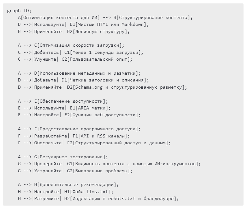 Структурирование контента. Использование чистого HTML или Markdown с логичной структурой помогает ИИ эффективно интерпретировать и взаимодействовать с контентом.